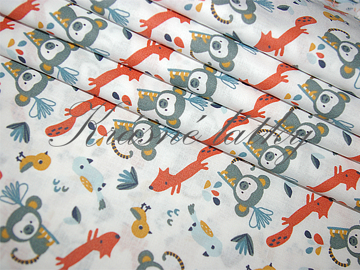 Bavlna s opičkami. Látka je v šířce 150 cm. Je splývavá a vhodná na bytové dekorace.
