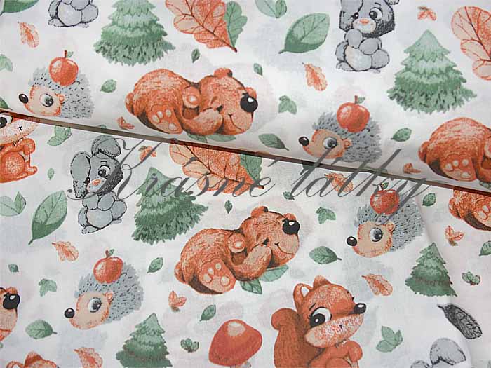 Dětská látka s motivem lesních zvířátek v lese je vhodná například na dětské povlečení, dětské závěsy a další bytový textil. Látka je atestovaná. Bavlněné dětské látky ze 100% bavlny - plátna nabízíme v metráži a mají atest Oeko-Tex Standard 100. Metráž objednávejte v násobcích pěti.