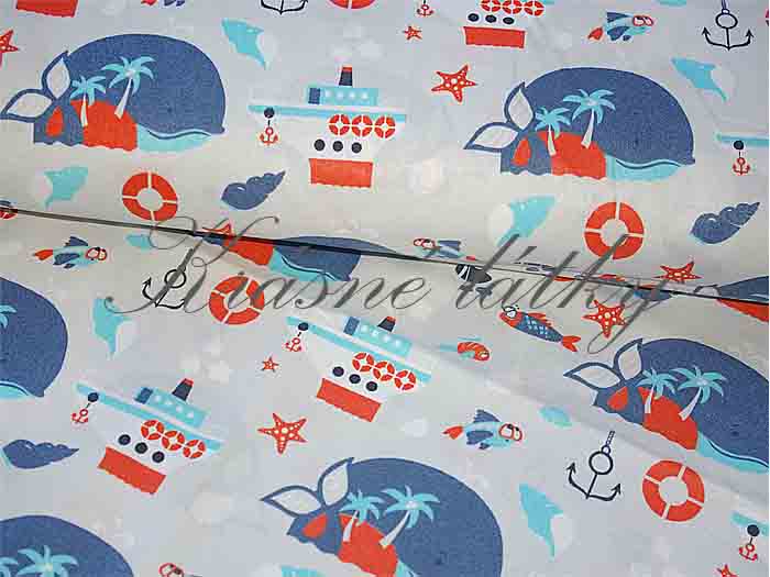 Bavlněná látka s velrybou a parníkem na 100% bavlně, vazba plátno