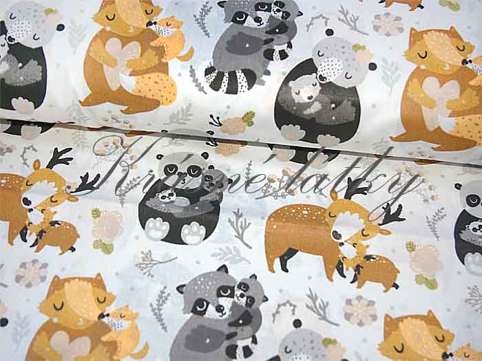 Krásná bavlněná látka pro děti na dětské povlečení, na závěsy do dětského pokojíčku, látka pro miminka, dětské ubrusy, povlaky na polštářky, hnízdečka pro miminka a další bytové výrobky. Atraktivní a módní vzor na bavlně s lesními zvířátky - liška, medvěd, jelen, mýval. Další bavlněné dětské látky se zvířecími vzory najdete v naší pestré nabídce látek v metráži.