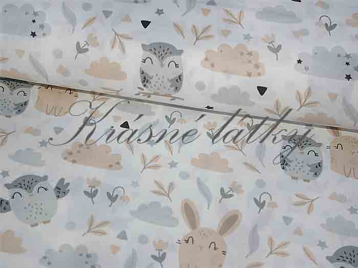 Bavlněná látka se sovou a zajíčkem na 100% bavlně, vazba plátno, béžové provedení