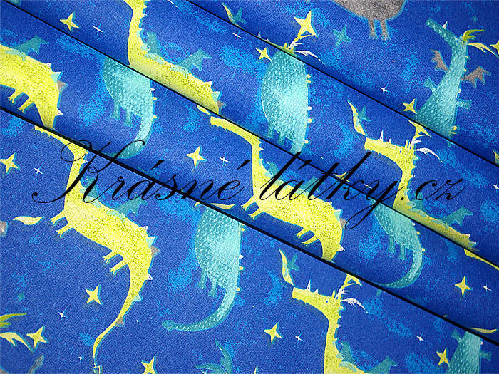 Bavlněná látka Draci. Látka je pevná, je v gramáži 150 g/m2. Povrch látky je jemný - hladký. Metráž Draci má atest. Látku můžete použít do dětského pokojíčku na veškerý bytový textil: povlečení do malé i velké postýlky, kapsáře, dekorace, závěsy, polštářky, hnízdečka pro miminka, zástěrky, mantinely, i oděvy např. košile a další výrobky. Látka je v krásných barvách, skvělé kvalitě. Je měkká a poddajná.