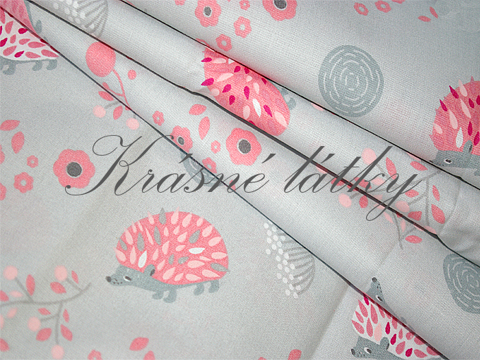 - Ježci, ježečkové, šedo růžové provedení, 100% bavlna, metráž se zvířátky
