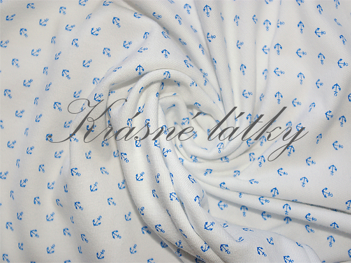 Krásná dětská látka bavlněný žerzej z bavlny. Látka má gramáž 170 g/m2. Provedení látky - tisk bavlněný žerzeje jednolícní. Motiv látky je s drobným vzorem kotev a jistě se stane oblíbenou látkou mezi dětmi. Z látky můžete ušít body, trička, mikiny, čepičky, šátky, kalhoty a další konfekční oděvy. Látka je certifikovaná pro děti do tří let, neobsahuje nikl, AZO barvy ani nikl. Látka tedy neobsahuje žádné zdraví škodlivé látky a je vhodná pro přímý styk s pokožkou. Další vzorovanou dětskou metráž single jersey, najdete v naší nabídce látek. Pestrá nabídka látek s námořnickými motivy. Tuto látku můžete kombinovat s látkami v našem obchodě. Látka je velmi příjemná a ve velmi dobré kvalitě. Krásná metráž pro chlapce. Další kojenecké látky, dětské úplety z bavlny máme v nabídce.