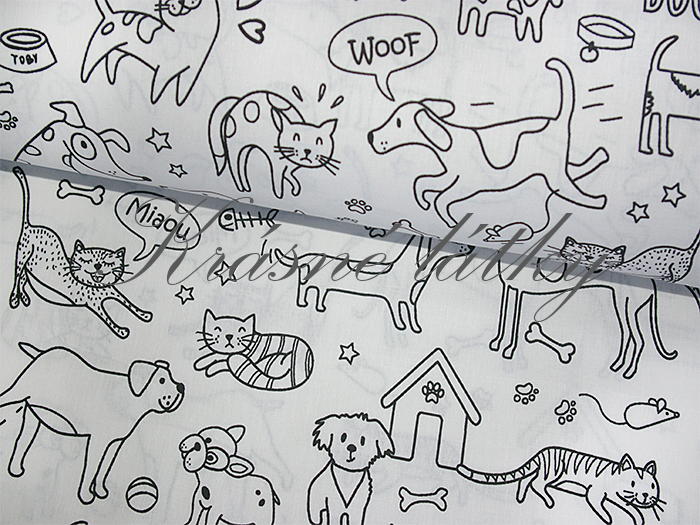 Hladké krásné bavlněné plátno na vybarvování - látkové vybarvovánky - látkové omalovánky na sněhově bílém podkladu v gramáži 120 g. Dětská bavlněná látka s motivem pejska a kočičky. Látku můžete použít i na konfekční nebo bytový textil. Látka má atest Oeko-Tex Standard 100. Metráž s atestem pro děti do tří let. Tento typ metrážové látky při měření obvykle nestříháme, ale trháme.