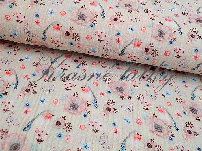 Mušelínová látka vzor ptáček, gázovina - 100% bavlna, mušelín – látky - metráž