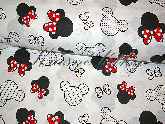 Roztomilá 100% bavlněná látka s motivem myšky s červenou mašlí na světlém podkladu. Lehká, prodyšná a příjemná na dotek, ideální pro dětské i bytové textilie. Skvělá volba pro kreativní šití a originální projekty.