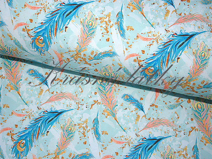Bavlněná látka Paví pera. Látka má vyšší gramáž, je pevná. Látku dodáváme v šířce 160 cm a je možné ji na dotaz zajistit i na jiném materiálu jako například, bavlněný satén, úplet, teplákovina, kočárkovina, minky, samet, sportovní materiál na legíny i trička, mušelní aj.