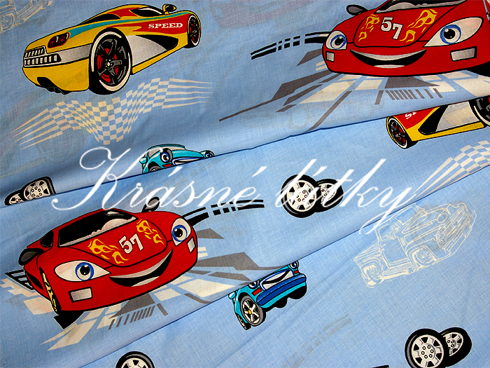 - Závodní auta - krásná látka např. na dětské povlečení,modrý podklad,metráž