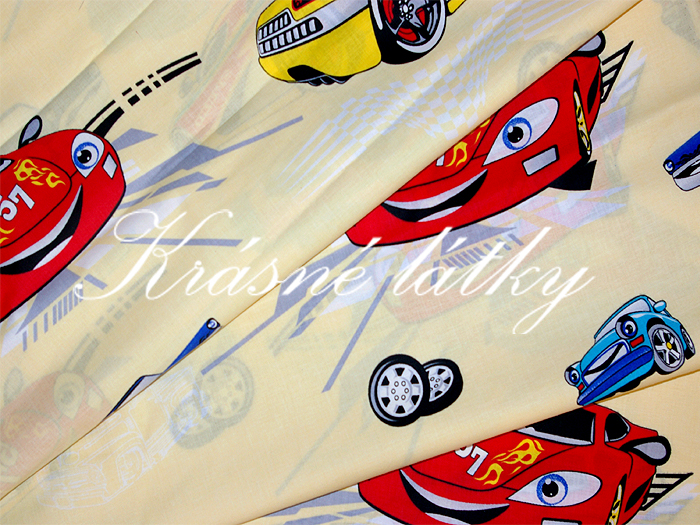 - Závodní auta- krásná látka např. na dětské povlečení,okrový podklad,metráž