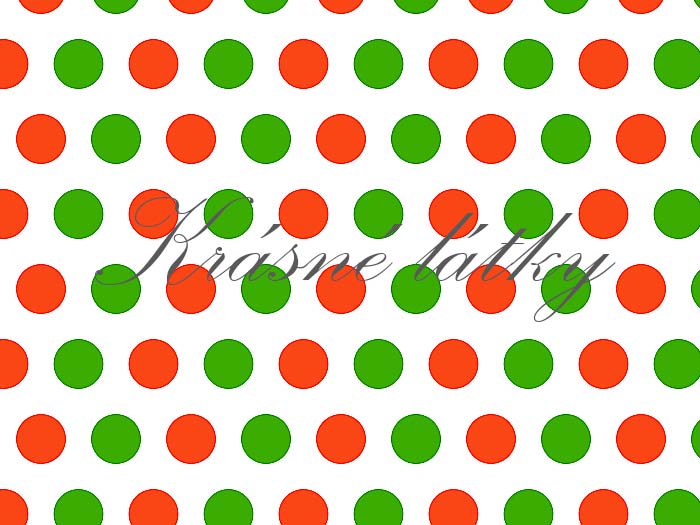 Krásné vysoce kvalitní bavlněné plátno v prémiové kvalitě s červeno zelenými puntíky do kombinace s dalšími látkami. Veselá látka do dětského pokojíčku nebo na různé dekorace. Látka je pevná, ale splývavá. Látka má hebký saténový povrch. Skvěle se hodí do kombince s dalšími látkami z této veselé barevné kolekce. Průměr puntíku je cca 5 mm.