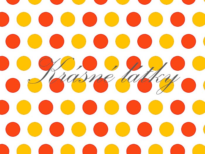 Krásné vysoce kvalitní bavlněné plátno v prémiové kvalitě s červeno žlutými puntíky do kombinace s dalšími látkami. Veselá látka do dětského pokojíčku nebo na různé dekorace. Látka je pevná, ale splývavá. Látka má hebký saténový povrch. Skvěle se hodí do kombince s dalšími látkami z této veselé barevné kolekce. Průměr puntíku je cca 5 mm.