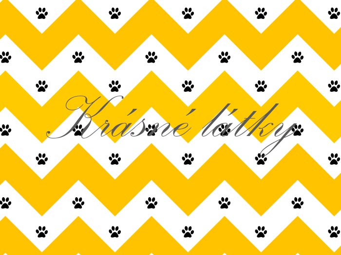 Bavlna žluto černý cik cak chevron s tlapkami, dětské látky metráž