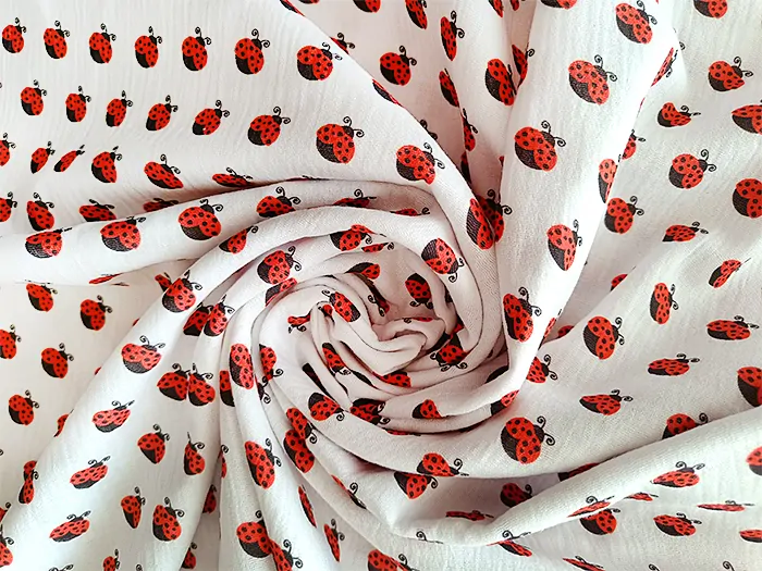 Měkkoučká mušelínová látka s beruškami na letní šatičky, tričko nebo tuniku. Látka je velmi příjemná do horkých letních dnů. Z látky můžete kromě oděvů ušít i povlečení, baldachýn, nebo soupravu do dětské postýlky.