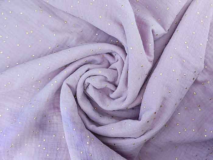 Látka je ve světle fialové lila barvě se zlatými kapičkami. Látka má atest pro děti do tří let. Metráž s atestem Oeko-Tex Standard 100. Nádherná, pastelová barva na tkanině mušelín se třpytem. Flitrová látka je zdobena zlatými kapičkami. Zlaté kapičky dodají látce na exkluzivitě. V nabídce v našem e-shopu s látkami najdete mnoho variant mušelínových látek s různými aplikacemi i bez. Látka je vhodná na léto, je vzdušná, prodyšná. Látka je vhodná pro miminka i dospělé.