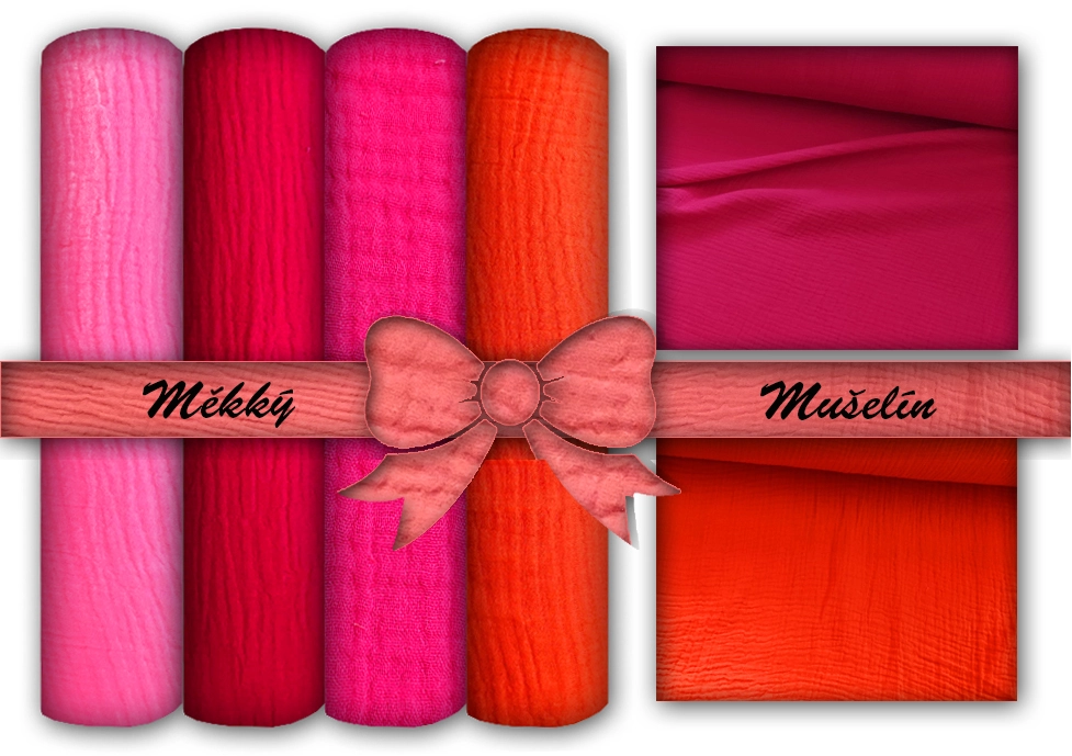Kolekce mušelínových látek vhodná k šití různých oděvů, zejména pro miminka. Mušelín je lehká letní látka s měkoučkou texturou. Z leva barva cukrová vata - bon bon, purpurový mušelín, cyklamenová, mandarinka, oranžový mušelín.