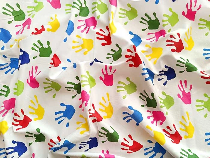Krásná barevná látka ruce je vhodná na trička, legínky, čepičky, mikin nebo třeba i hraček. Látku můžete použít na další výrobky. Látka je v krásných jasných - pestrých barvách, je na sněhově bílém podkladu. Barevné otisky rukou v různých odstínech přinášejí radostný a hravý vzhled, který oživí každý kus vytvořeného oděvu. Látka je měkká, pružná a příjemná na dotek, což zajišťuje pohodlí pro vaše děti. Bavlněná látka - úplet, má atest pro děti do tří let. Jde o metráž s atestem OekoTex Standard 100. S touto látkou zaručeně vykouzlíte kreativní a originální kousky!